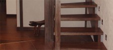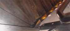Видимые компоненты: металлический косоур обшитый тонированным дубом, ограждение стекло и нержавейка